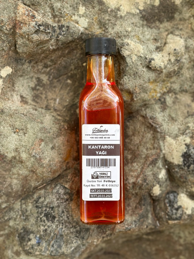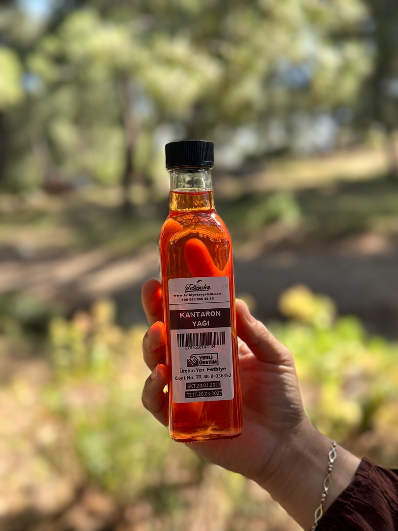 Fethiye'nin yüksek bölgelerinde doğal olarak yetişen sarı kantaron bitkisinden, soğuk sıkım zeytinyağında geleneksel yöntemle bekletilerek elde edilen bu doğal kantaron yağı, %100 katkısız ve saf formdadır.